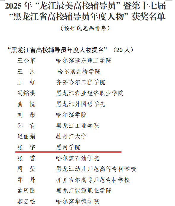 近日,中共黑龙江省委教育工作委员会公布了2025年“龙江最美高校辅导员”暨第十七届“黑龙江省高校辅导员年度人物”的评选结果,本次评选经学校推荐、资格审核、通讯评审、述职答辩等环节,我校计算机与信息工程学院辅导员张宇荣获2025年“黑龙江省高校辅导员年度人物提名”荣誉称号。