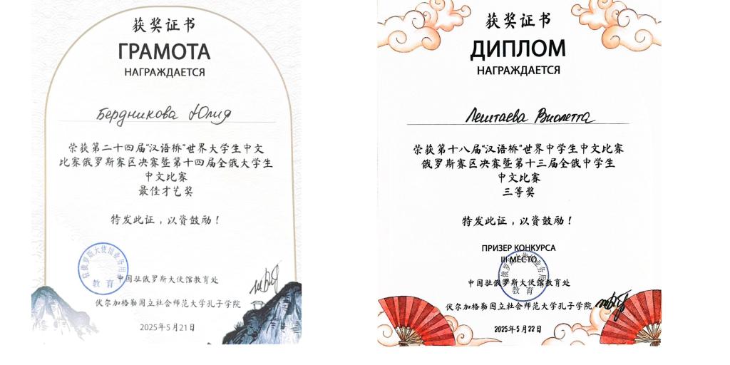 赛事成绩创下历史新高。在“汉语桥”世界大、中、小学生中文比赛俄罗斯赛区选拔赛中,孔子学院选派选手首次实现大、中、小学全学段全覆盖获奖——斩获大学生最佳才艺奖,中学生与小学生均荣获三等奖,展现出俄罗斯本土汉语教学的扎实成效与学员的综合素养。