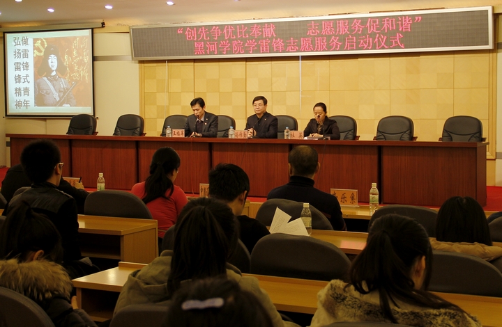 在本次学雷锋志愿服务月中,我院将集中开展“维护校园安全和谐,创建环保节约校园”、“珍惜同窗情义,共创文明寝室”、“展国门学子风采,爱第二故乡黑河”等青年志愿服务活动。