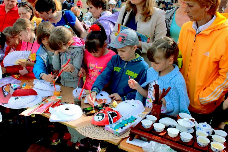 参加展示的有俄罗斯、乌兹别克等具有民族代表性的手工艺品、土特产。来自俄罗斯不同民族的青少年们身着节日盛装表演了精彩的文艺节目。作为唯一的外方代表队,孔子学院的教师们展示的中国茶艺、太极拳、手绘京剧脸谱、手编中国结、中国剪纸吸引了众多的俄罗斯观众,成为最受关注的展区。参展的中国教师一边演示一边讲解其中的寓意,俄罗斯观众在展区内戴着中国结,品着中国茶,向中国教师学习绘制京剧脸谱,剪裁喜欢的图案,并将自己亲手制作的中国文化作品和中国教师的祝福带回家,把中国文化的美好寓意带回家。