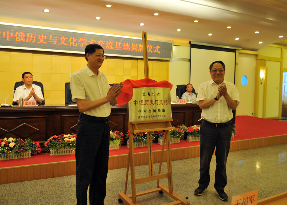 在热烈的掌声中,张正明、宋立权两位领导共同为黑龙江省中俄历史与文化学术交流基地揭牌。