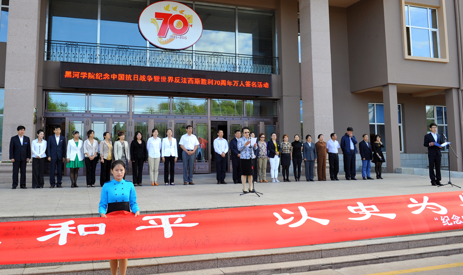 本网讯(记者 王佳 赵宇)9月3日上午,我校党委宣传统战部、团委、中俄边疆历史文化与社会发展研究中心联合举办了主题为“勿忘国耻 珍爱和平 以史为鉴 展望未来”的纪念中国人民抗日战争暨世界反法西斯战争胜利70周年万人签名活动。俄罗斯阿穆尔州副主席帕拉托夫、布拉戈维申斯克市议长雷先科、阿穆尔州老年人协会和布拉戈维申斯克市老战士协会的32名老战士,黑河市委常委、宣传部长姜福,黑河军分区政委白景新,黑河市人大副主任、市总工会主席何宝顺,黑河市政协副主席、市公安局局长李晓龙,黑河市文管会主任吴玉燕等领导到校参加活动;我校党委副书记杨宏、党委副书记兼工会主席李廷栋、副校长张焕强、车永宏和万名师生参加签名活动。