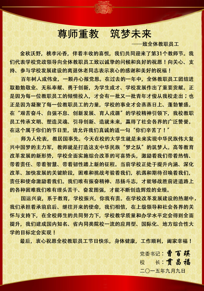 党委书记曹百瑛、校长贯昌福教师节致辞