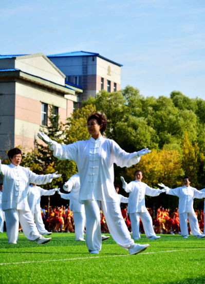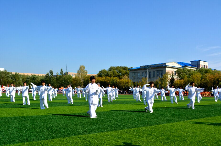 离退休老干部工作处组织的由63位离退休老职工表演的太极拳以及各学院带来的团体操,武术表演。