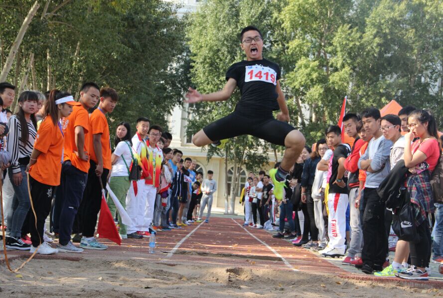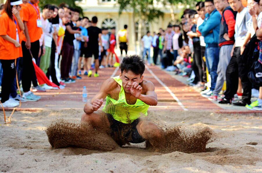 旗帜落下,我们起步、加速,猛地飞到空中。腿在空中自由的蹬踏,想要飞跃、飞跃。努力的跳到最远的沙坑中。“安全落地”蹬踏起的沙砾,心中的喜悦之情难以言表。