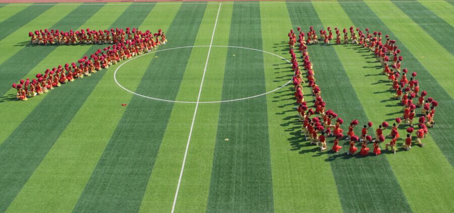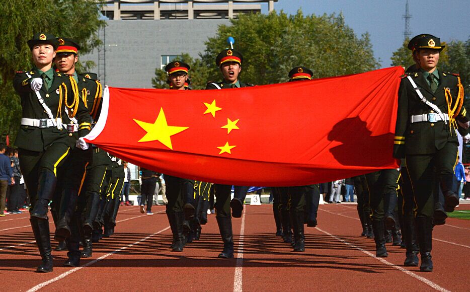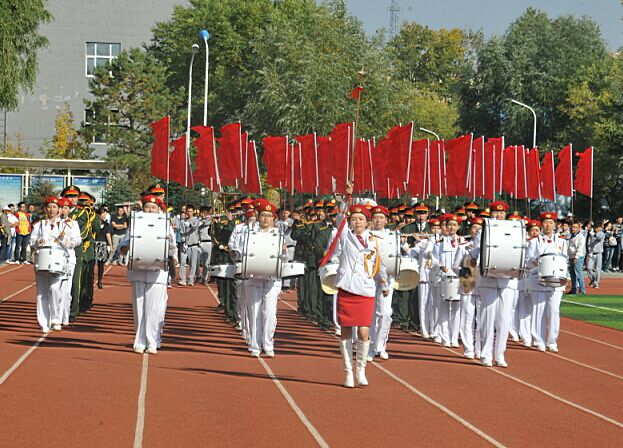 音乐学院管乐队奏响中华人民共和国国歌,鲜艳的五星红旗在运动场冉冉升起,迎风飘扬。