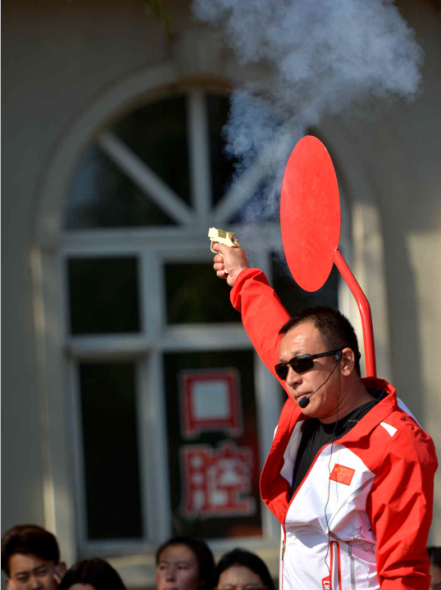 手执发令枪,眼戴黑墨镜。发令员就是那位严厉、公正的人。枪声响,白烟冒,那是运动员起跑的信号,那是奔向终点最开始的旗帜。