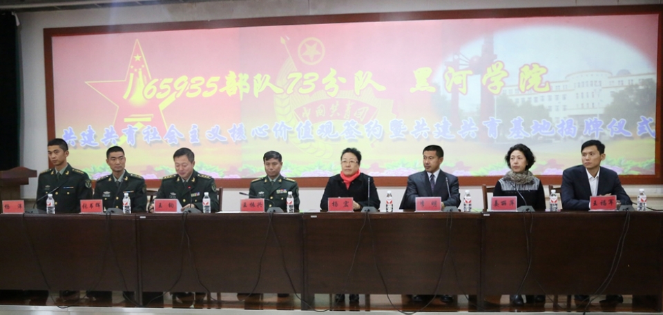 本网讯(记者 赵宇 摄影 周盼 王凤鸣 )10月9日下午,我校与“黑河好八连”共建共育社会主义核心价值观签约暨共建共育基地揭牌仪式在“黑河好八连”部队营地多功能厅举行。学校党委副书记杨宏、黑河军分区副政委王振兴、学生工作部(学生处)·武装部部长李明、思想政治理论课教学科研部主任姜丽萍、团委书记王福军及“黑河好八连”73分队队长张书辉出席此次签约仪式。