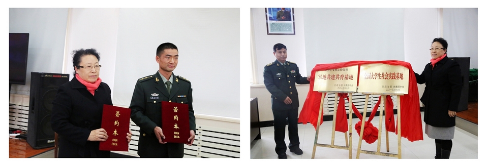 最后,我校党委副书记杨宏与“黑河好八连”73分队队长张书辉签署共建协议,并与黑河军分区副政委王振兴共同为“全国大学生社会实践基地”和“社会主义核心价值观军地共建共育基地”揭牌。