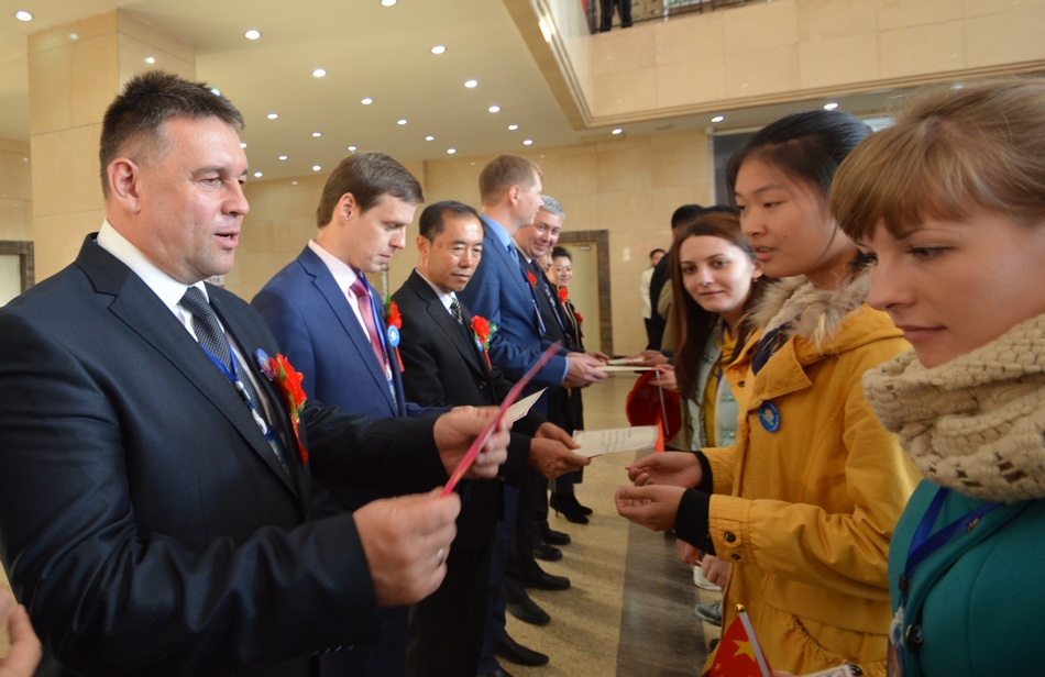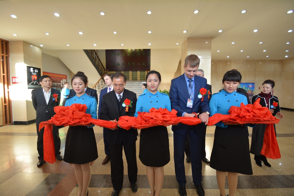 与会中俄领导为摄影作品展开幕式剪彩并向作者代表颁发参展证书
