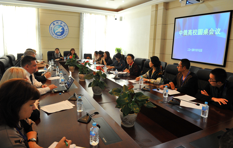 本网讯(记者 王佳 )10月15日下午,作为第六届“携手青春 共享阳光”国际青年大会系列活动之一的“中俄高校圆桌会议”在明德楼二楼会议室举行,俄罗斯布拉戈维申斯克国立师范大学副校长基列耶夫·阿列克谢·亚历山大洛维奇、中国黑河学院党委副书记杨宏与来自布拉戈维申斯克国立师范大学、东北农业大学、齐齐哈尔医学院、绥化学院、黑河学院的二十余位教育工作者围绕“爱国主义与公民教育”这一主题进行了深入探讨和交流。