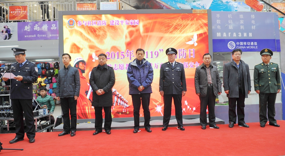 本网讯(特约记者 张铎 摄影 赵宇 刘思佳)为全面深入开展“119消防日”宣传活动,切实增强全民的消防安全意识,11月6日上午,我校副校长车永宏率领40名大学生消防志愿者参加了黑河市政府在华富商城一楼举办的主题为“参与社区消防 建设平安家园”2015年119消防日活动。黑河市委常委、副市长潘杨,黑河市政协副主席、市公安局党委书记、局长李晓龙,市安监局局长袁亚东,共青团黑河市委员会书记付振南,黑河市文明办副主任詹大伟,黑河市公安局副局长姜伟斌,黑河市消防支队支队长张国祥,政委毕永军及各社区消防志愿者代表共同参加了本次活动。