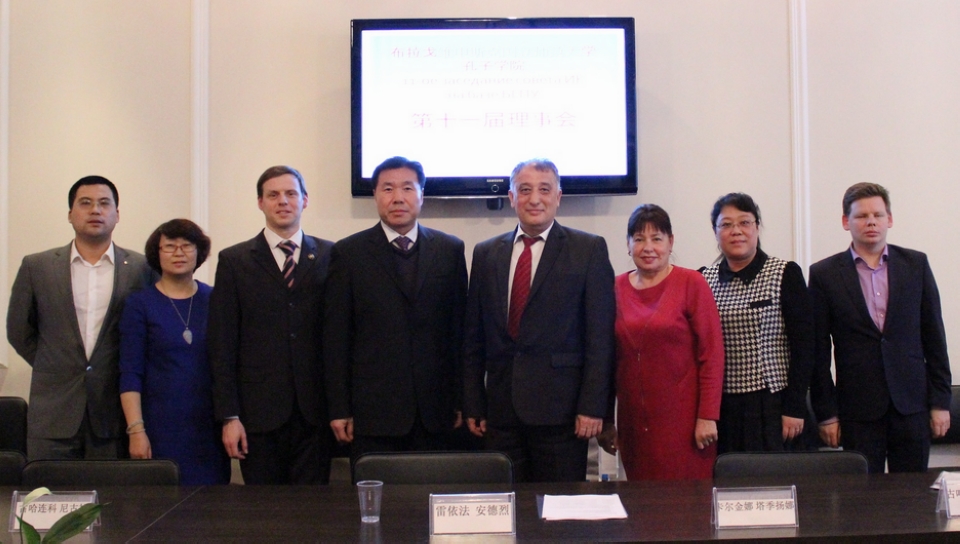 本网讯(特约记者 宗成菊)布拉戈维申斯克国立师范大学孔子学院第十一届理事会于2015年12月17日在布拉戈维申斯克国立师范大学462会议室举行。布拉戈维申斯克国立师范大学校长列依法·安德烈、副校长卡尔金娜·塔季扬娜,我校校长贯昌福、外事处处长刘昱洁,孔子学院俄方院长古哈连科·尼古拉、中方院长宗成菊及部分理事会成员参加会议。会议由孔子学院理事古哈连科·谢尔盖主持。