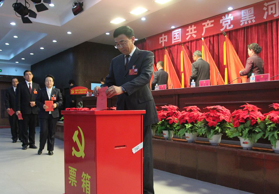 大会执行主席曹百瑛宣读了中国共产党黑河学院第一届委员会委员、纪律检查委员会委员候选人名单;全体代表选举通过了总监票人、监票人、计票人建议名单,并以无记名投票的方式选举产生新一届党委委员11人,纪委委员5人。当选的党委委员有车永宏、丛喜权、宁艳杰、许海深、李廷栋、杨宏、吴春娟、邹辉、张焕强、曹百瑛、董贵杰,纪委委员有王书武、阮放、吴晓莉、姜占民、董贵杰(按姓氏笔画为序)。