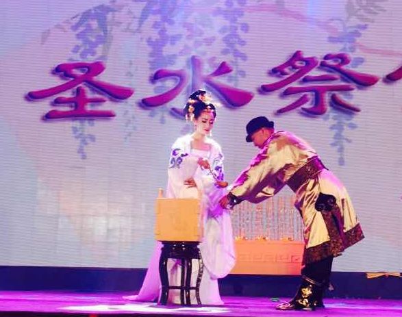 圣水祭是每年万众期待的祈福仪式,在聚集两万人的圣水广场,伴随着神秘隆重的萨满舞,“圣水女神”付亚楠款款而来,为六位各名族长老和民众祈福施水,布福四方苍生。