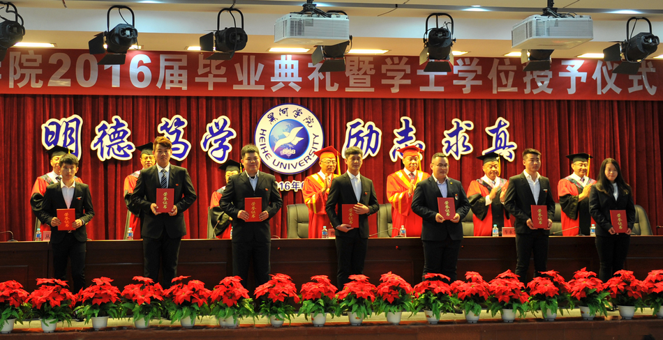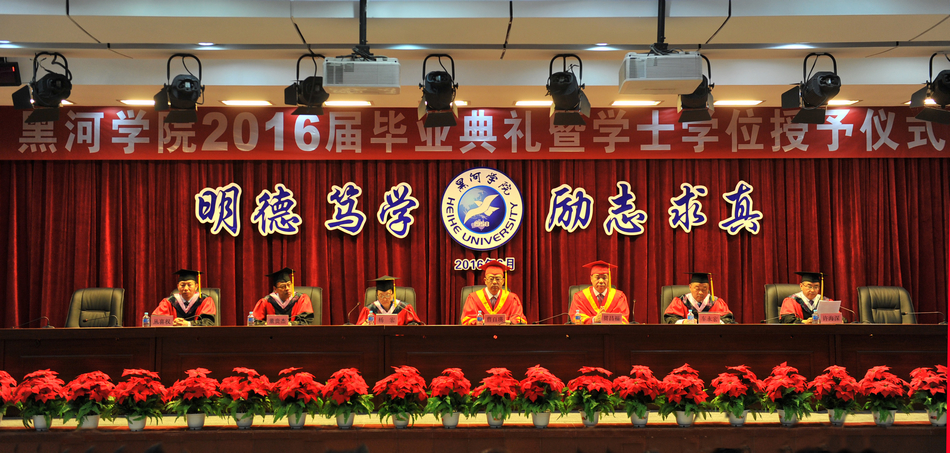 在《黑河学院院歌》声中毕业典礼拉开帷幕。校长贯昌福为毕业生代表文化旅游学院2012级历史学专业学生何欣颐拨流苏,颁发学位证书和毕业证书,并代表学校对圆满完成学业的同学们表示热烈的祝贺,向多年来为学生健康成长付出辛勤劳动的广大教职工表示崇高的敬意。他说,大学是人生的最美好的时光,大学阶段奠定了未来事业发展的坚实基础。四年前,同学们怀揣着梦想进入黑河学院,四年中,同学们在学习中转变,在转变中成熟,取得的优异成绩和为学校赢得的荣誉是毕业生留给学校最好的礼物。贯校长勉励毕业生要珍惜时代赋予的使命,做一个志存高远、追求卓越的人,做一个品德高尚、懂得感恩的人,做一个明理诚信、敢于担当的人,做一个谦虚谨慎、勤学善思的人,在实现中华民族伟大复兴中国梦的征途上奉献聪明才智,成就自己的梦想。