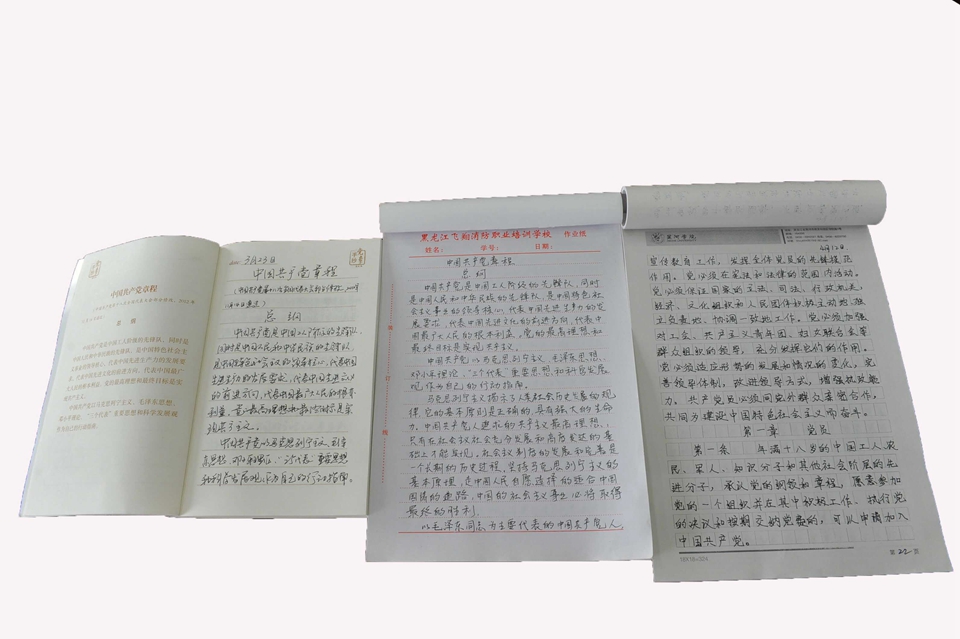 自学校实施“两学一做”学习教育以来,机关党总支认真开展学习讨论,并组织全体党员积极参与“百日手抄党章”活动。活动中,领导干部带头,党员齐参与,掀起了一股“重读党章、手抄党章”的热潮。党员们发挥创意,参展作品形式多样,既有字迹工整,态度严谨的整本抄写,又不乏剪纸、书法、硬笔等充满特色的创意作品。党员们用抄写诵读的方式来提升党性修养和党纪意识,加深对党的纲领的理解,坚定理想信念。