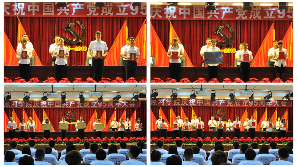 会上,副校长张焕强宣读了中共黑龙江省委高校工委和省教育厅党组、中共黑河市委及中共黑河学院委员会关于表彰“先优”的决定。外国语学院党总支获省级“先进基层党组织”,王守文、张秀平获省级“优秀共产党员”,安全义获省级“优秀党务工作者”;美术与设计学院党总支获市级“先进基层党组织”,曹福全、张璐获市级“优秀共产党员”,王冬雁获市级“优秀党务工作者”;机关党总支、图书馆党总支、理学院党总支学生党支部、人文传媒学院党总支学生党支部获校级“先进基层党组织”,卢丽艳、闫英、丛永柱、张宇、王井荣获校级“优秀党务工作者”,高孝成等38名同志获校级“优秀共产党员”荣誉称号。