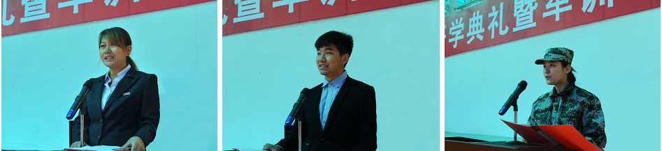 经济管理学院教师张璐代表全体教师发言,她表示将严守师德、爱岗敬业,为学生健康成长、早日成才贡献力量;文化旅游学院潘潇同学代表在校生鼓励学弟学妹们要为实现自己的梦想而努力奋斗,规划好自己大学四年的学习;来自教育科学学院2016级新生代表肖尧同学承诺在军训中将发扬吃苦耐劳的精神,锤炼坚韧不拔的意志,服从命令,听从指挥,刻苦锻炼,自强不息,做新时代的高素质大学生。