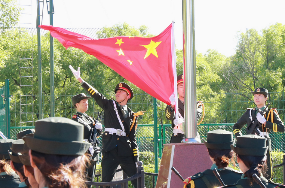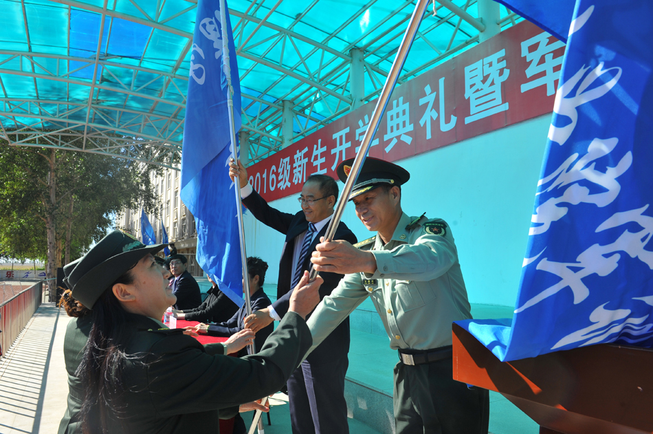 黑河军分区副政治委员王振兴大校向黑河学院军训大队授旗,并与我校副校长、军训大队大队长许海深一同为各学院授黑河学院军训中队旗。