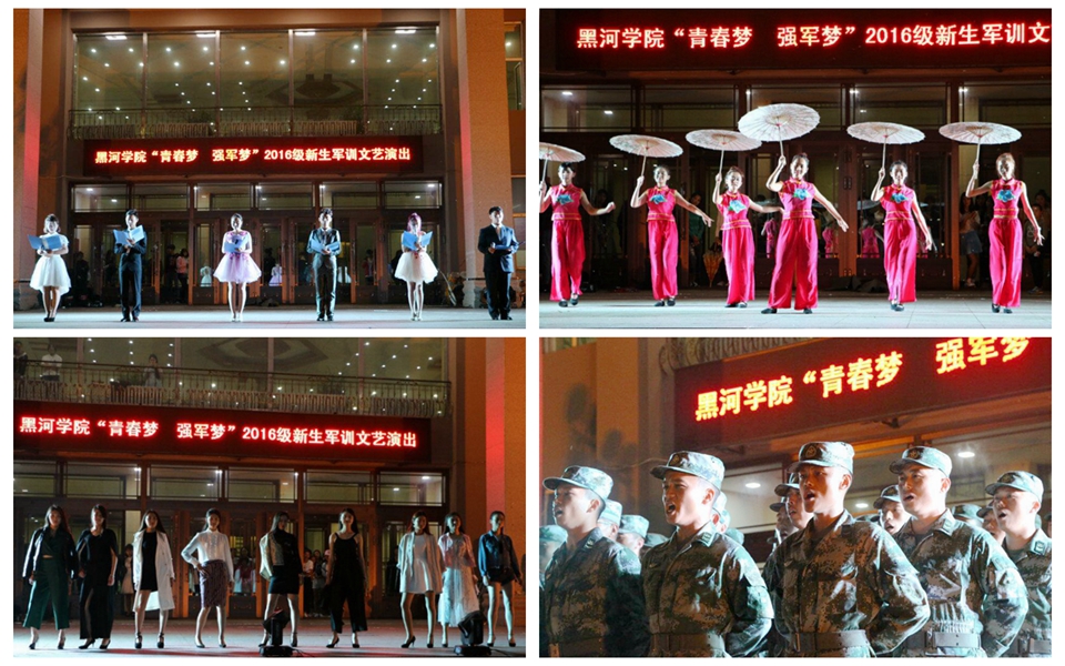 本次文艺演出不仅充分展现了学子们多才多艺的精神风貌,使广大新生在辛苦的军训过程中,有效地缓解了疲劳和压力,也使新生们在欢乐祥和的气氛中快速融入集体,感受黑河学院这个温暖的大家庭带来的爱与温暖。