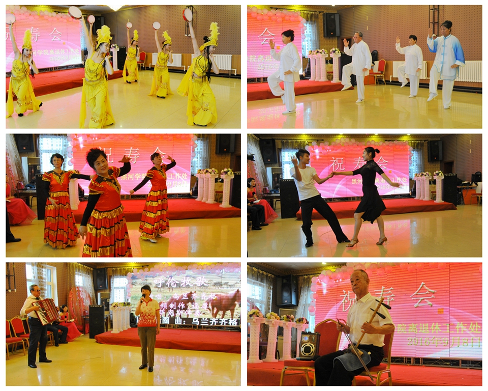 祝寿会上,离退休的老教师和音乐学院的学生们献上了精彩的歌舞表演。充满民族风情的维吾尔族舞蹈,绵柔有力的太极拳,舒展柔美的拉丁舞,旋律悠长的内蒙长调,声情并茂的诗朗诵以及舞姿曼妙的布鲁斯舞蹈等节目为寿星们带来快乐的同时,也让他们感受到诚挚的祝福和关怀。演出过程中,副校长张焕强为老教师们送上了生日礼物并亲手为85岁高龄的伦启祥老师送上蛋糕寿桃。吃着香甜的蛋糕,手捧着生日礼物,听着声声祝福的话语,老教师们露出了欣慰的笑容。