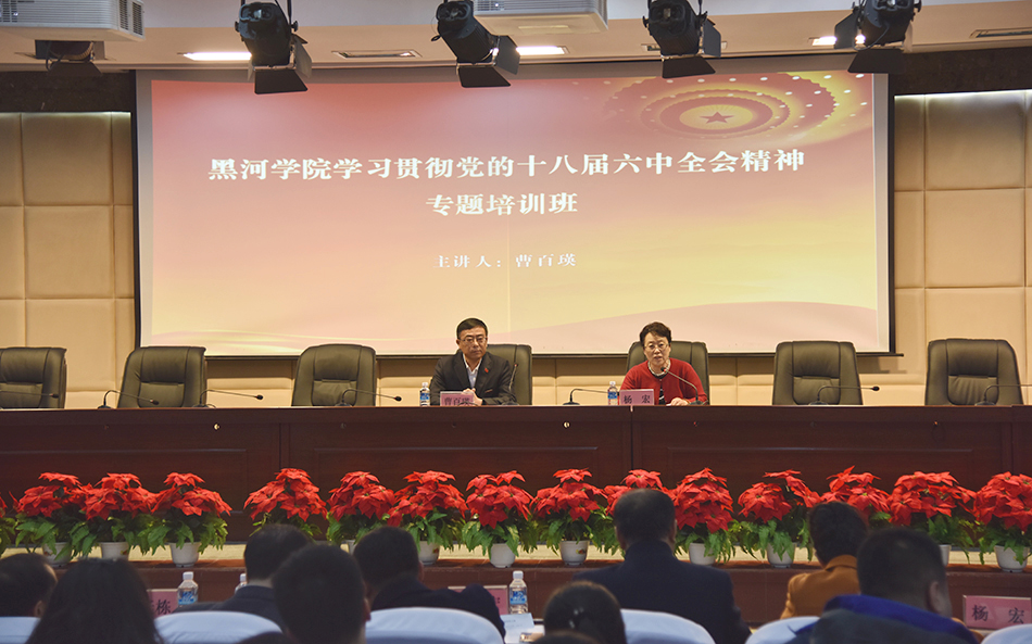 本网讯(记者 王佳 摄影 何振东 郑承江)为深入学习贯彻十八届六中全会精神,全面理解和准确把握《关于新形势下党内政治生活的若干准则》《中国共产党党内监督条例》各项要求,3月27日至29日,学校面向全校副科级以上干部、党总支委员和党支部书记、辅导员、思政课教师开展学习贯彻党的十八届六中全会精神专题培训,党委书记曹百瑛为培训班学员作专题辅导。