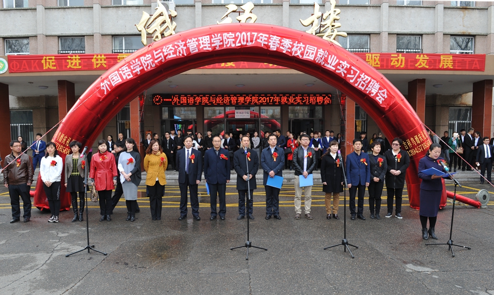 本网讯(记者 赵宇)4月23日,第二届外国语学院与经济管理学院“扬就业之帆,启梦想之旅” 2017年春季校园就业、实习招聘会暨黑河市劳动就业局“促进供需精准对接,助力创新驱动发展”民营企业招聘周活动在俄语楼前隆重举行。学校党委副书记李廷栋、副校长许海深,黑河市人力资源和社会保障局党委委员、劳动就业局局长肖冰雁,市工商联副主席张杰,共青团黑河市委副书记张雪及黑河市教育局、中小企业协会、爱辉区劳动就业局和我校各部门、各学院相关负责人出席了开幕式。