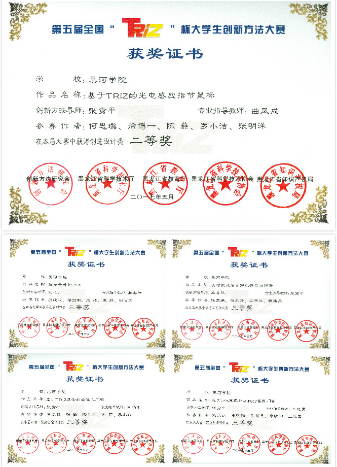 本网讯(特约记者 谭树滨 记者 关月)5月14日,第五届全国“TRIZ”杯大学生创新方法大赛在哈尔滨工程大学落下帷幕。我校选派参赛的五支团队表现出色,分别荣获二等奖1项、三等奖4项。教师辛明远、朱团获得“创新方法教学优秀成果奖”称号,教师谭树滨荣获“优秀组织工作者”称号,黑河学院获得“优秀组织单位”称号。