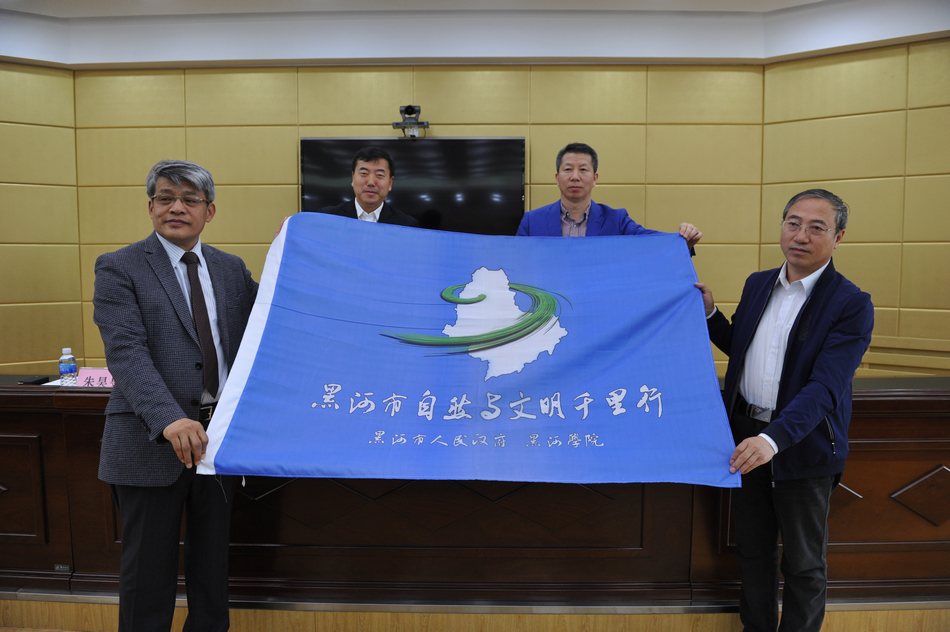 本网讯(学生记者 郑承江)5月31日14时,“黑河市自然与文明千里行”项目启动仪式在黑河市政府二楼会议室召开,副市长马春波与我校副校长丛喜权向“黑河市自然与文明千里行”项目总负责人王禹浪、项目副主任谢春河授旗。启动仪式由市社科联主席朱昊旻主持。