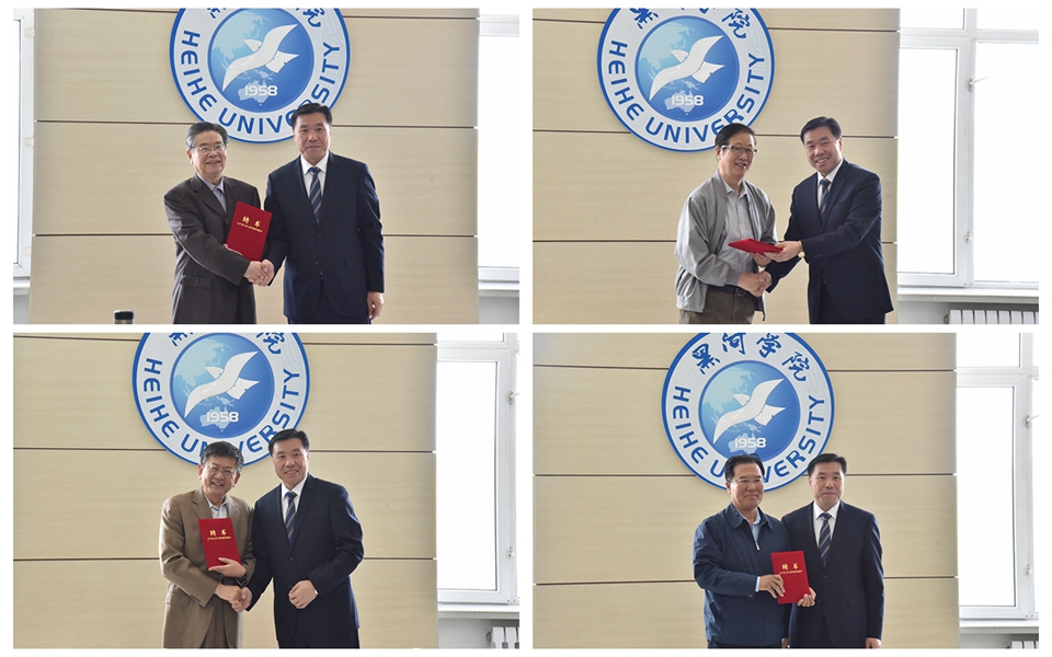校长贯昌福为王海运、徐坚、陆南泉、程伟等六位专家颁发“黑河学院俄罗斯远东智库咨询委员会专家”聘书。