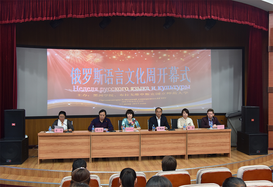本网讯(记者 何振东)6月12日,在“俄罗斯世界”基金会支持下,由布拉戈维申斯克国立师范大学与黑河学院联办的“俄罗斯语言文化周”在俄语楼小剧场开幕。布拉戈维申斯克国立师范大学国际系主任扎列斯卡娅·奥丽佳·弗拉基米洛芙娜,国际教育与合作处项目管理科科长、孔子学院教务科长古哈林科·谢尔盖·弗拉基米尔洛维奇,我校副校长许海深、教务处处长柴华及中俄师生代表200余人参加开幕式。开幕式由外国语学院院长姜占民主持。