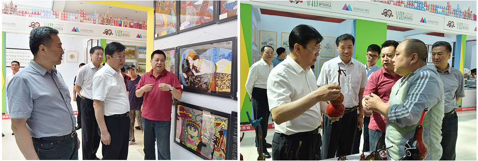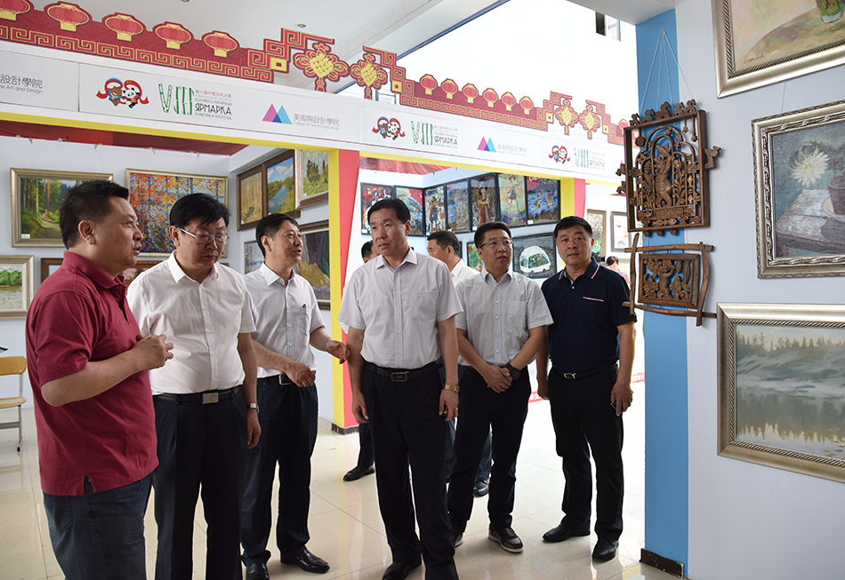 市委书记秦恩亭,市委副书记、市长谢宝禄一行走进每个展区,在学生创作的油画、国画、水彩画、漆画、书法、篆刻、陶艺、布艺纤维作品前都认真观赏,并与师生亲切交谈,询问工作学习情况,了解创作理念和创作技巧,鼓励师生立足黑河文化资源优势,创作出更多既有时代特征又有地域特点的优秀作品,让优秀的本土艺术作品走向市场,走进企事业单位,走进千家万户。
