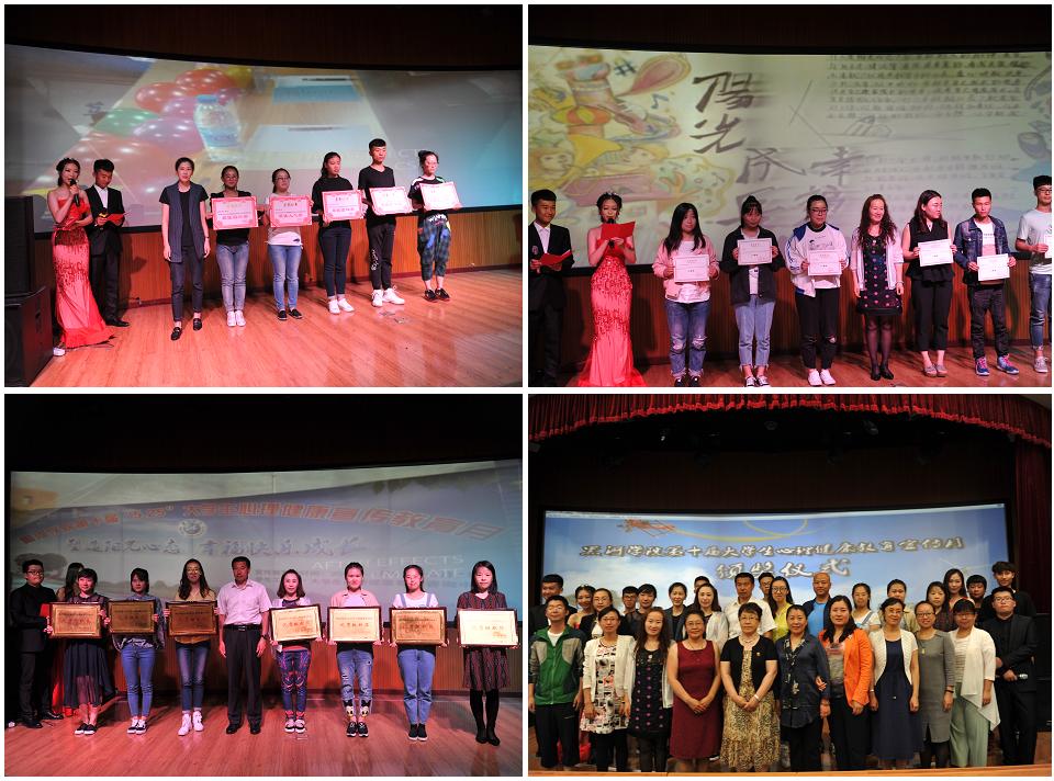 与会领导为“素质拓展训练”“心理板报与手抄报设计大赛”“校园心理情景剧大赛”“心理演讲比赛”获奖个人及集体颁发荣誉证书。理学院、教育科学学院、外国语学院、美术与设计学院、音乐学院、计算机与信息工程学院、文化旅游学院获得第十届大学生心理健康宣传教育月优秀组织奖。