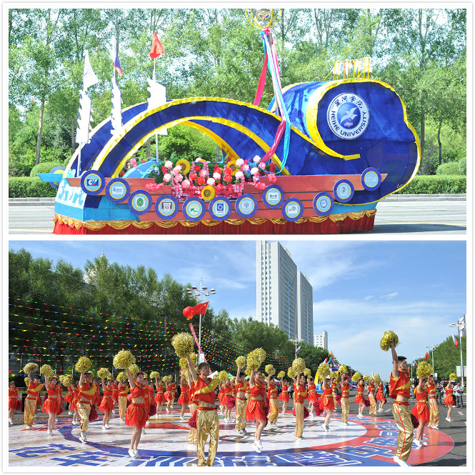 作为中俄文化大集开幕式的一项重要环节,我校设计、制作的花车与来自各市县区的28辆巡游花车、2000余名巡游演员,共同营造了一场精彩绝伦的视觉盛宴。我校花车以“学通四海”为主题,以船型为主体造型,辅浪花、船帆和拱形桥梁,象征着我校在中俄教育合作中所起到的纽带作用。六名来自不同国家和中国不同民族的大学生在花车上与市民激情互动,音乐学院学生的俄罗斯风情舞蹈得到了观众们的一致好评,体现了我校国际化的办学特色和学生深厚的艺术功底。