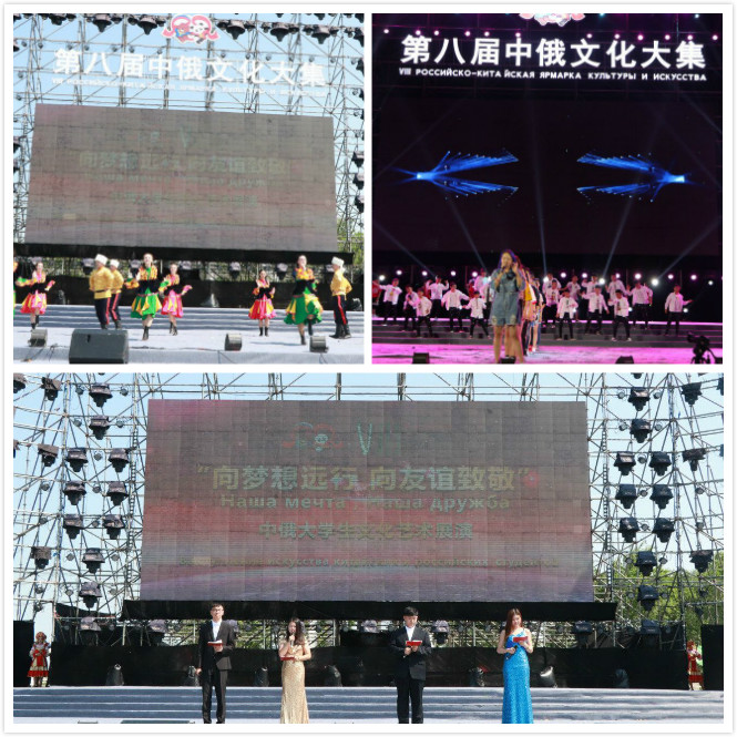 在以“向梦想远行向友谊致敬”为主题的中俄大学生文化艺术展演上,我校学生与俄罗斯青年同台献艺。歌曲《大中国》、舞蹈《傣乡情》、舞蹈《荷塘晚韵》、哑剧《文明观影》将中华经久传承的文化底蕴展现的淋漓尽致。俄罗斯青年带来的歌曲《喀秋莎》、舞蹈《勺子舞》《楚瓦什民族舞》《哥萨克舞蹈》、手风琴独奏《草地圆舞曲》等节目,让全场中国观众感受到了异域文化的别样魅力。