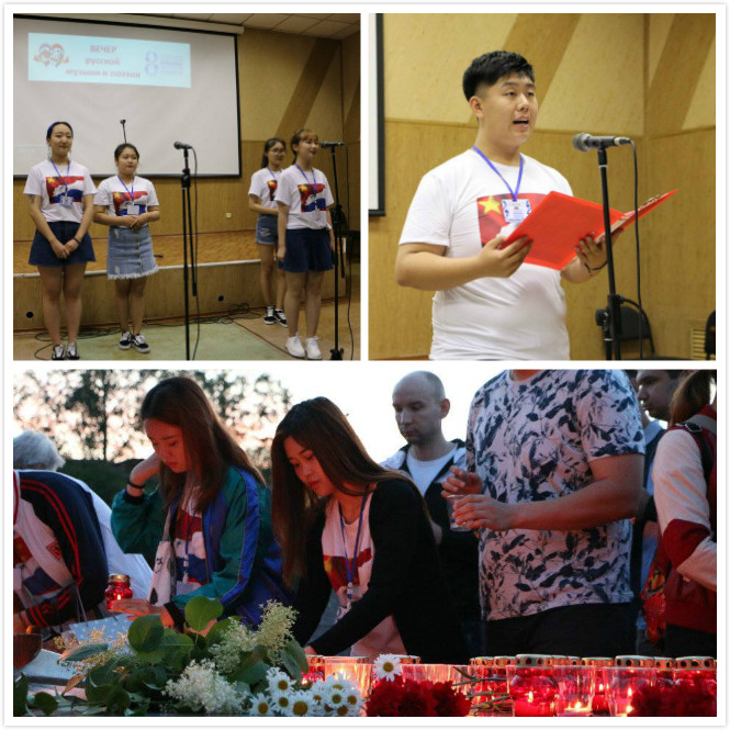 在俄罗斯布拉戈维申斯克市进行的中俄文化大集交流活动中,我校15名学生代表先后参观了列宁广场、胜利广场、博物馆,参加了俄罗斯经典诗文朗诵活动,并为在卫国战争中牺牲的先烈献上蜡烛,表达青年学生向往和平、友好的意愿。