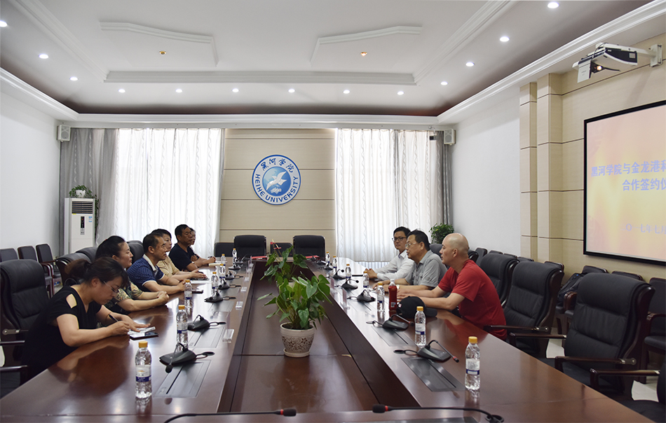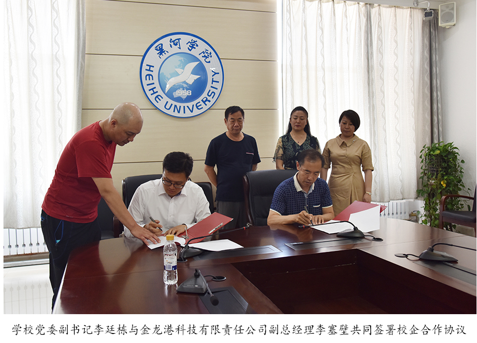 本网讯(特约记者 陈丽华 摄影 何振东 关月)7月10日,黑河学院与黑河金龙港科技有限责任公司校企合作签约仪式在明德楼二楼会议室举行。原黑河市政协副主席张强富、金龙港科技有限责任公司副总经理李塞壁,学校党委副书记李廷栋、教务处处长柴华,理学院院长邱敏、党总支书记刘立等参加签约仪式。签约仪式由党委副书记李廷栋主持。