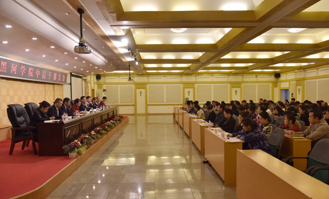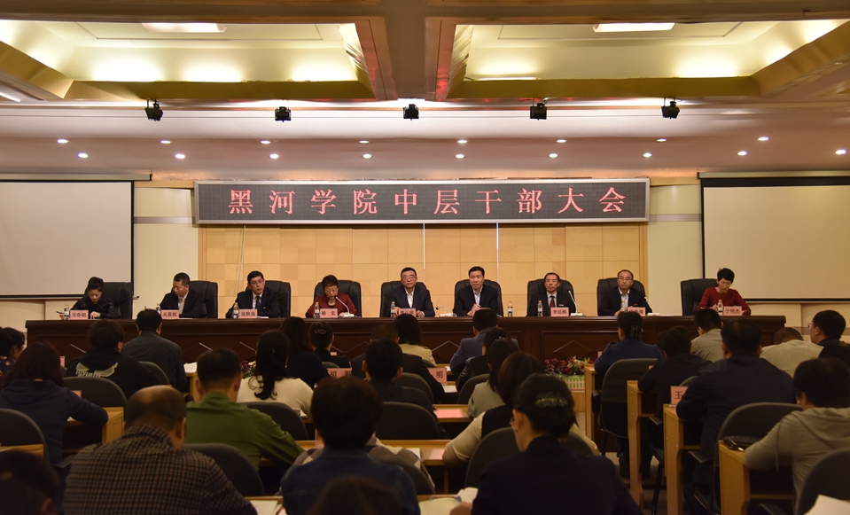 校长贯昌福对2017年学校整体工作进行了总结。他指出,过去的一年,学校在省委、省政府和省委高校工委、省教育厅的正确领导下,全面落实“质量立校”战略,进一步优化专业结构,教育教学质量进一步提高;积极推进硕士专业学位授权点申报工作,举办10余次高层次学术会议和专家学术报告会,正式启动“黑河市自然与文明千里行”,科研水平进一步提升;强化师德师风建设,抓好人才引进、培养、使用三个环节,师资队伍建设进一步加强;拓展国际交流合作领域,中俄文化交流活动深入开展,特色办学优势进一步凸显;加强大学生思想政治教育和心理健康教育,全面落实“奖勤助贷补”等资助政策,完善就业创业服务体系,学生教育管理进一步强化;提高资金使用效益,加强基础设施建设,服务保障能力进一步增强;建立创业故事实践基地,申报省级共享型创新创业孵化基地,大力支持大学生创新创业活动,创新创业工作进一步推进;进一步完善民主决策、科学决策机制,加强“三重一大”管理和监督,依法治校工作进一步深入;教职工福利待遇稳步提高,健全突发事件应急管理机制,成立校友会,和谐校园建设进一步推进。一年来,学校各项工作取得了显著成绩,得到了省委省政府的高度评价,为学校发展赢得了全新的发展机遇。