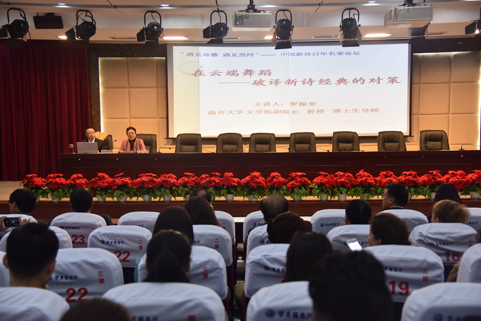 本网讯(记者 赵宇 摄影 郑秋郁)9月28日下午,由中国诗歌万里行组委会、中共黑河市委宣传部主办,黑河市文学艺术界联合会、黑河市作家协会、黑龙江省华瑞文化传播有限公司及我校联合承办的“遇见诗歌 遇见黑河”——中国新诗百年名家论坛在我校求知楼报告厅举行,论坛特邀南开大学文学院副院长、穆旦新诗研究中心主任罗振亚教授作题为《在云端跳舞——破译新诗经典的对策》学术讲座。黑河市诗歌爱好者及我校师生200余人聆听了讲座。党委副书记杨宏主持讲座。