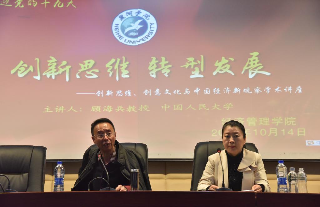 本网讯(特约记者 王小琬 摄影 关月)为迎接党的十九大胜利召开,营造良好学术氛围,阐释“创新”发展理念,10月14日下午,我校特邀中国人民大学经济学院顾海兵教授作题为《创新思维、创意文化与中国经济新观察》的学术讲座。300余名师生聆听了讲座。经济管理学院党总支书记卢丽艳主持讲座。