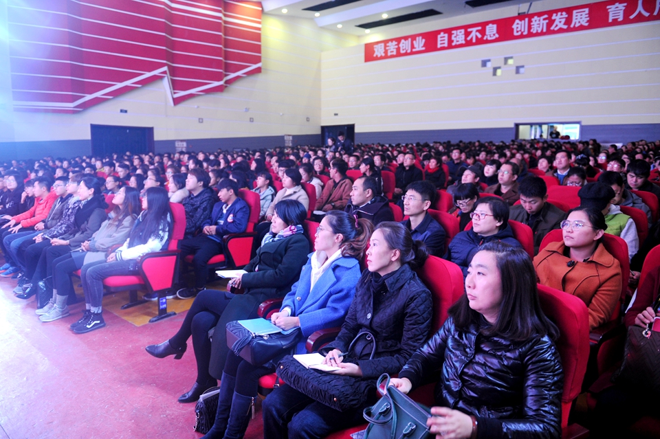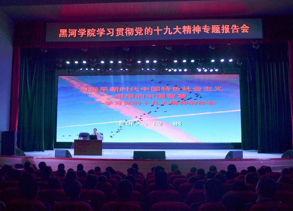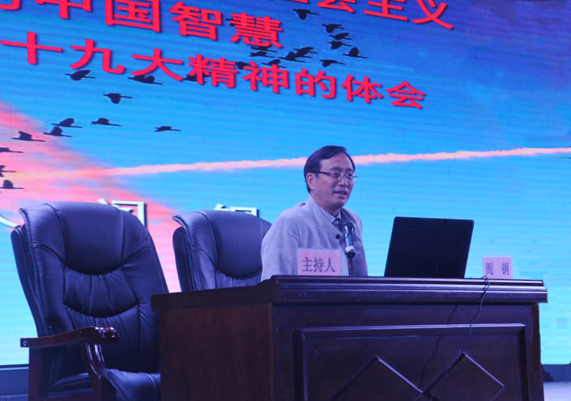 本网讯(记者 赵宇 摄影 赵芮)10月27日下午,学校举行学习贯彻党的十九大精神专题报告会,特邀四川大学马克思主义学院阎钢教授为师生作了题为《习近平新时代中国特色社会主义思想的中国智慧》专题报告。学校党委副书记李廷栋,副校长张焕强、车永宏、丛喜权,党委委员、总会计师、财务处处长宁艳杰,党委委员、组织部部长邹辉与800余名师生共同参加学习。党委委员、宣传统战部部长吴春娟主持会议。