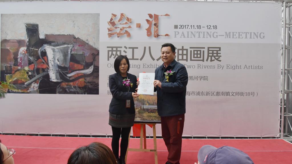 开幕式上,我校美术与设计学院院长戚锋向上海浦东新区南汇博物馆赠送画作《边塞风光》,南汇博物馆馆长马英为戚锋颁发了永久收藏证书。
