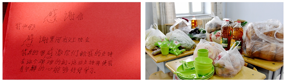 22日下午,黑河市义工协会会长崔爱虹与3名协会成员来到学校为三名留学生送上祝福和丰富的日用品、食品,三名留学生将亲笔写的中文感谢信送与对他们帮助的师生和义工们。“我真的很感谢你们给我的支持,在这个艰难的时刻,这些支持将使我有宁静的心能够好好学习……”。