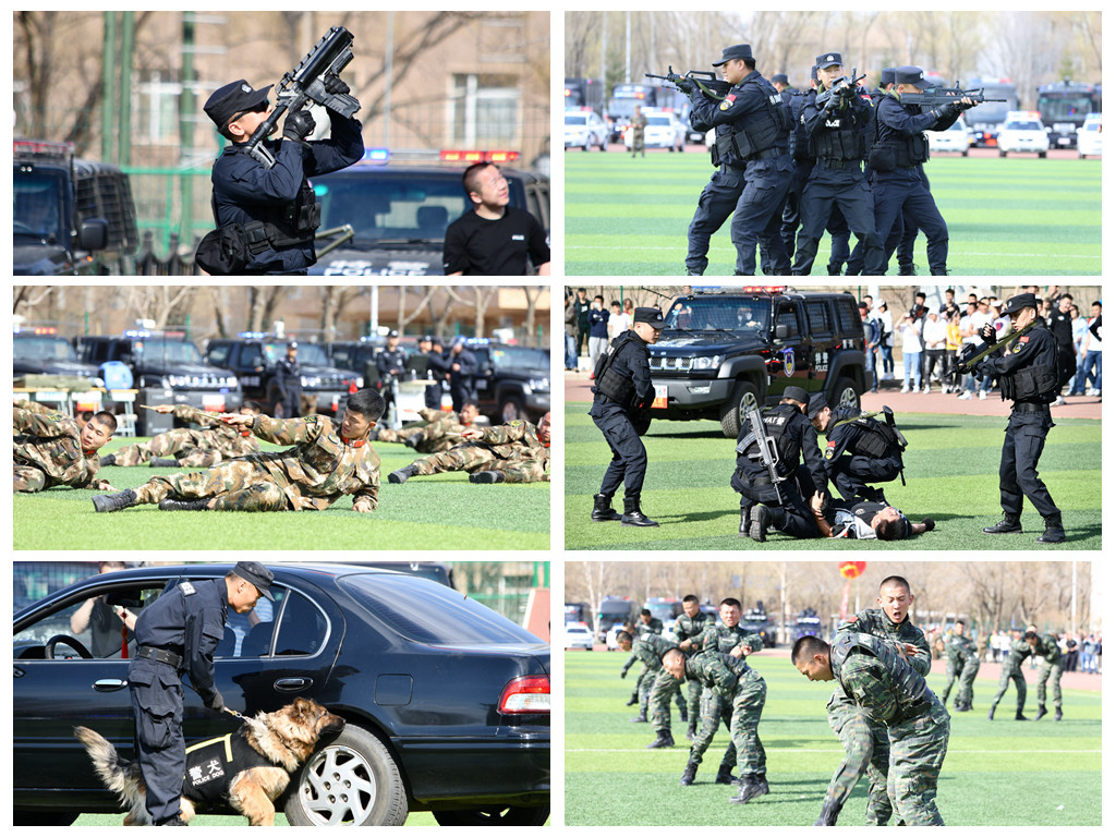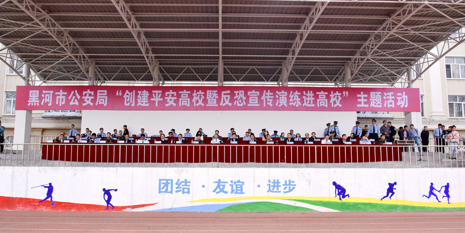 本网讯(记者 赵宇)为进一步强化高校校园安全工作,提高校园突发事件处置能力,4月25日下午,学校与市公安局在田径运动场联合开展了“创建平安高校暨反恐宣传演练进高校”主题活动。黑河市政府副市长、市公安局局长、市反恐怖工作领导小组副组长邓福才,我校副校长张焕强、车永宏,纪委书记董贵杰,副校长许海深及省反恐办、省公安厅、市委政法委、市公安局领导,公安民警、武警、边防、消防官兵与中外师生6000余人到场观摩。