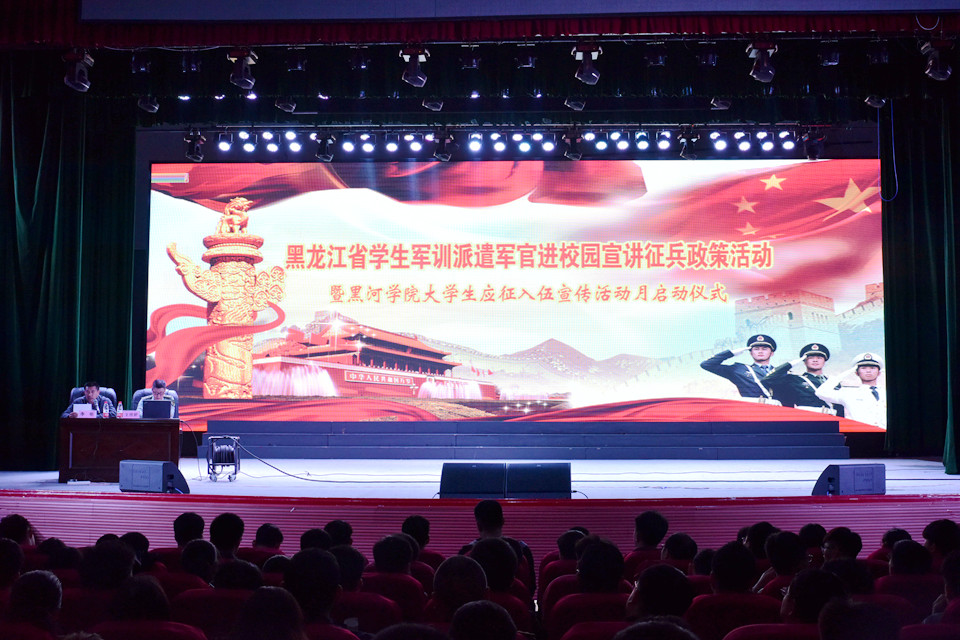 本网讯(特约记者 梁策 摄影 张硕鹏 郑秋郁)黑龙江省征兵办、省教育厅定于4—5月在高校集中开展学生军训派遣军官进校园宣讲征兵政策活动,5月7日晚,学校在明德楼礼堂举行了黑龙江省学生军训派遣军官进校园宣讲征兵政策活动暨黑河学院大学生应征入伍宣传活动月启动仪式。学校特邀黑龙江省军区学生军训教研处主任王欣研中校为学生们作征兵政策宣讲。副校长张焕强,爱辉区武装部政治委员李会上校,校招生就业处相关负责人、各学院党总支书记、辅导员及800余名学生参加了本次活动。活动由学生工作部(学生处)·武装部部长李明主持。
