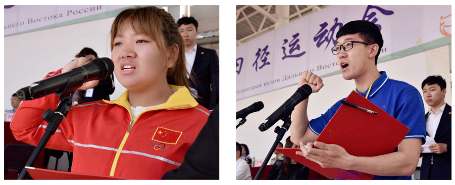 教育科学学院2016级学生姚禹鑫代表运动员宣誓要恪守体育道德、弘扬体育精神;体育学院2015级学生赵轶代表裁判员宣誓将严格裁判、公平竞赛。