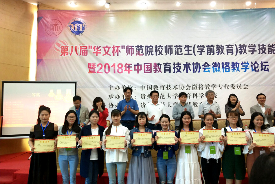 本网讯(特约记者 陈丹)6月2-4日,由中国教育技术协会微格教学专业委员会主办的第八届“华文杯”全国师范生教学技能大赛在贵州师范大学成功举办。我校教育科学学院学前教育专业5名学生参赛,获得特等奖1项,二等奖2项,三等奖7项。