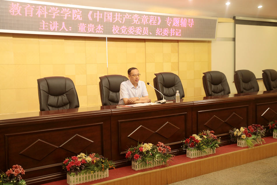 本网讯(特约记者 于琳 摄影 王磊)6月6日下午,党委委员、纪委书记董贵杰应邀为联系部门——教育科学学院党总支教师党员和学生入党积极分子120余人在明德楼五楼多功能厅作《中国共产党章程》专题辅导报告。