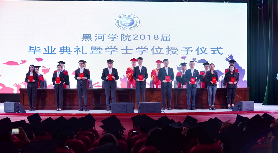 随着雄壮的国歌奏唱完毕,毕业典礼正式开始。校长贯昌福为毕业生代表美术与设计学院学生郑超拨流苏,颁发学位证书和毕业证书,并代表学校对圆满完成学业的同学们表示热烈的祝贺,向多年来为学生健康成长付出辛勤劳动的广大教职工表示崇高的敬意。贯校长激动地说,大学是人生最美好的时光,奠定了未来事业发展的坚实基础。四年前,你们怀揣梦想进入黑河学院。四年中,你们在学习中转变,在转变中成熟。今天,共有2525名同学顺利毕业。其中有30%以上的同学获得过国家、省、校级“三好学生”“优秀学生干部”等各类荣誉称号,有近百名毕业生考取了硕士研究生,有的毕业生在全国高校商业精英挑战赛、全国数学建模大赛、全国“TRIZ”杯大学生创新设计大赛等科技、文艺比赛中取得了优异成绩。贯校长对毕业生为学校发展建设所作出的贡献表示衷心的感谢,他勉励毕业生要珍惜时代赋予的使命,做一个志存高远、追求卓越的人,做一个品德高尚、懂得感恩的人,做一个明理诚信、敢于担当的人,做一个勤学善思、苦干实干的人,担当起时代使命,汇聚起青春力量,以青春筑梦、以奋斗圆梦,在追梦的过程中实现人生价值。
